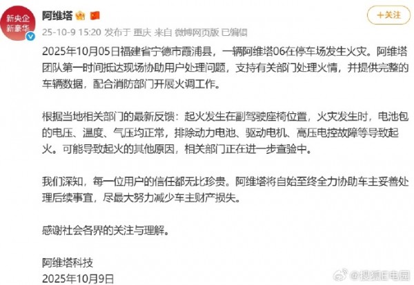 【#阿维塔官方回应自燃事件# 排除电池起火原因】10月9日消息,针对福建霞浦一阿维塔06起火,引燃旁边七辆车一事,阿维塔官方今日发布声明称:2025年10月5日福建省宁德市霞浦县,一辆阿维塔06在停车场发生火灾。阿维塔团队第一时间抵达现场协助用户处理问题,支持有关部门处理火情,并提供完整的车辆数据,配合消防部门开展火调工作。