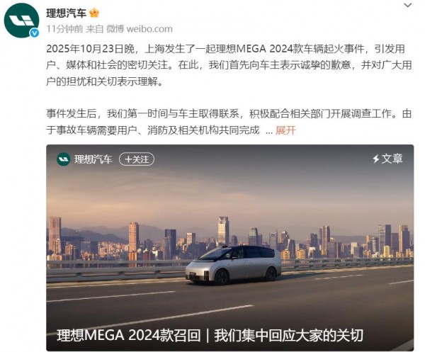 2025年10月23日晚,上海发生了一起理想MEGA 2024款车辆起火事件,引发用户、媒体和社会的密切关注。在此,我们首先向车主表示诚挚的歉意,并对广大用户的担忧和关切表示理解。