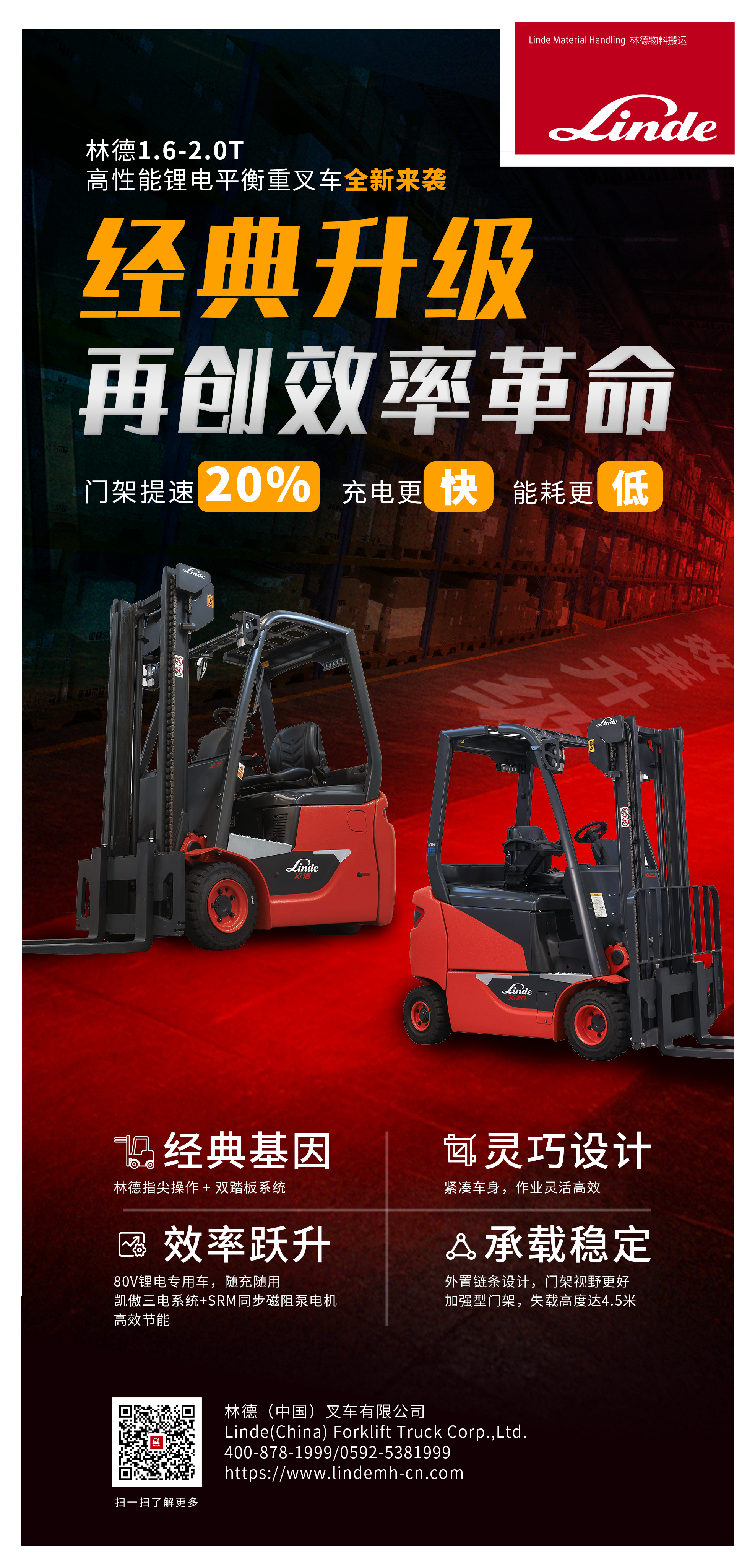 今日,林德为经典注入澎湃锂电基因,推出新一代1.6-2吨林德高性能锂电平衡重叉车,以动力性能、能效管理、智能科技等方面革新升级,全面激活客户的搬运效益!