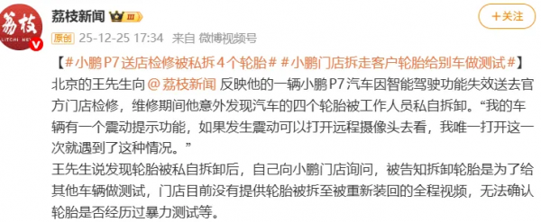 北京车主王先生的小鹏P7因智能驾驶功能失效送修官方门店,维修期间车辆震动提示功能突然报警。王先生通过远程摄像头查看时,意外发现维修人员正在拆卸自己车辆的四个轮胎。涉事门店工作人员解释称,当时店内没有其他尺寸合适的备用胎,修理工在未告知车主的情况下私自拆下轮胎,给另一辆车上路测试抖动问题。事件曝光后,小鹏汽车集团已介入调查。