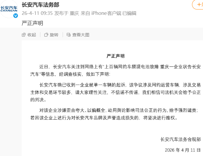 今日上午,长安汽车发布“严正声明”,声明称,近日,长安汽车关注到网络上有“上百辆网约车频现电池故障,重庆一企业状告长安汽车”等信息,经调查核实,做如下声明:长安汽车确已收到一企业就单一车辆的起诉,该争议涉及网约运营车辆,涉及交易主体和交易环节较多,请大家理性关注,不信谣不传谣,我们相信司法机关会给予公正的判决。对该企业涉嫌歪曲夸大、以偏概全,动用舆论影响司法公正的行为,给予强烈谴责;若因该企业上述行为对长安汽车品牌及声誉造成损失的,将坚决进行维权。然而,针对长安汽车4月11日发布的“严正声明”,涉事企业微笑出行4月11日中午回应称,百余台长安网约车动力电池集中故障、严重影响运营,是铁一般的事实!我司维权,是维护企业合法权益的正当权利,绝非‘以偏概全’‘干扰司法’。产品出问题不整改,反而指责维权者,长安汽车此举令人不齿。我们证据齐全,将坚决维权到底!微笑出行负责人鲁先生表示,维权从两年前就已经开始,长安汽车及相关公司一直没有解决。此前据奔流新闻报道,微笑出行因运营车队中上百辆长安品牌新能源网约车频繁出现动力电池故障,严重影响日常运营,向法院提起诉讼,将于5月27日在重庆市两江新区人民法院开庭审理。