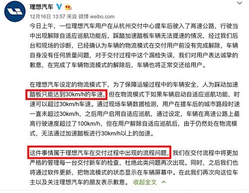 事后,理想汽车救援成员来到现场,解决了问题。12月16日下午13时,理想汽车在官方微博回应此事:这辆ONE在交付后没有完全关闭“物流模式”。