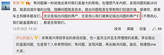 16日下午14时,“开心的廷儿”最新微博下,理想汽车创始人李想回应到:车主反应问题是对车企的帮助,不担心舆论出来搞。