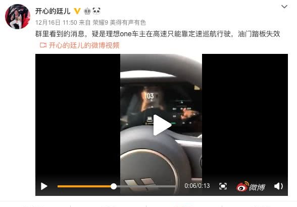 12月16日上午,一位汽车爱好者在体验理想汽车ONE过程中发现,车子油门踩到底,最高时速仅30迈,如果开上高速并开启“定速巡航”,车子也只能开到100迈。这位爱好者将现场情况用手机拍摄成短视频,并发布在微博上,引来众多网友议论纷纷。