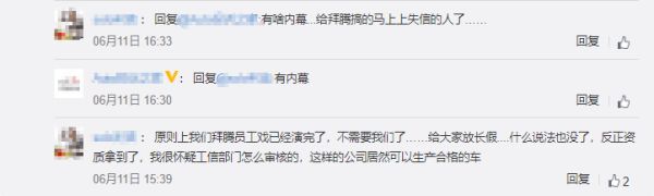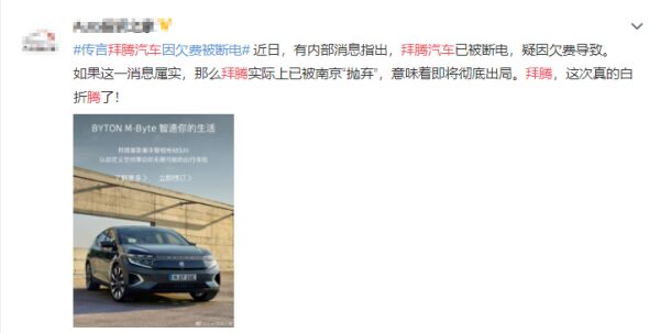 据媒体报道,拜腾汽车工厂疑因欠费被相关方断电,员工也大量离职和流失。一名自称拜腾员工的网友则声称表示“原则上我们的戏已经演完了,不需要我们了,给大家放了长假,什么说法也没有。”有评论称“如果消息属实,这是否意味着,拜腾汽车已基本宣告出局。”拜腾汽车对上述的消息没有任何回应。