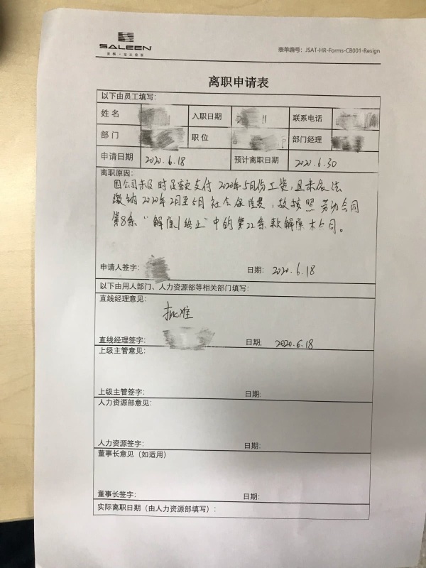 公司管理层原本给出的解决方案是,让员工都主动递交一份离职申请书,大致意思是:由于公司难以为继,无法继续提供办公场所,没有收到工作指令,以及未及时收到薪资。按照劳动手册第8.2章节的规定,员工提出离职,并且保留争取自己自身权益的权力。
